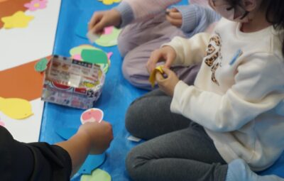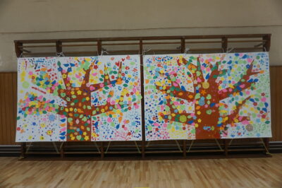 先天性上肢形成不全児の家族交流会が開かれ、今回は工作の共同作業として「貼り絵で大きな木を作ろう」と楽器演奏会を行いました。